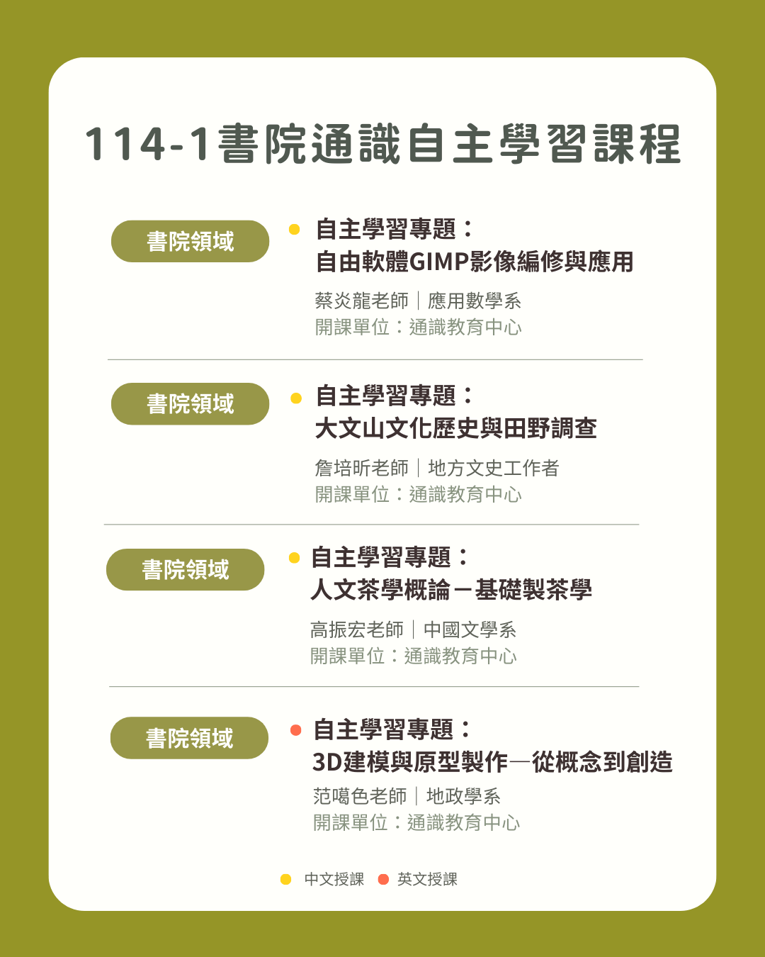 | 書院領域 | 自主學習專題:大文山文化歷史與田野調查 | 詹培昕 | 教務處通識教育中心 |