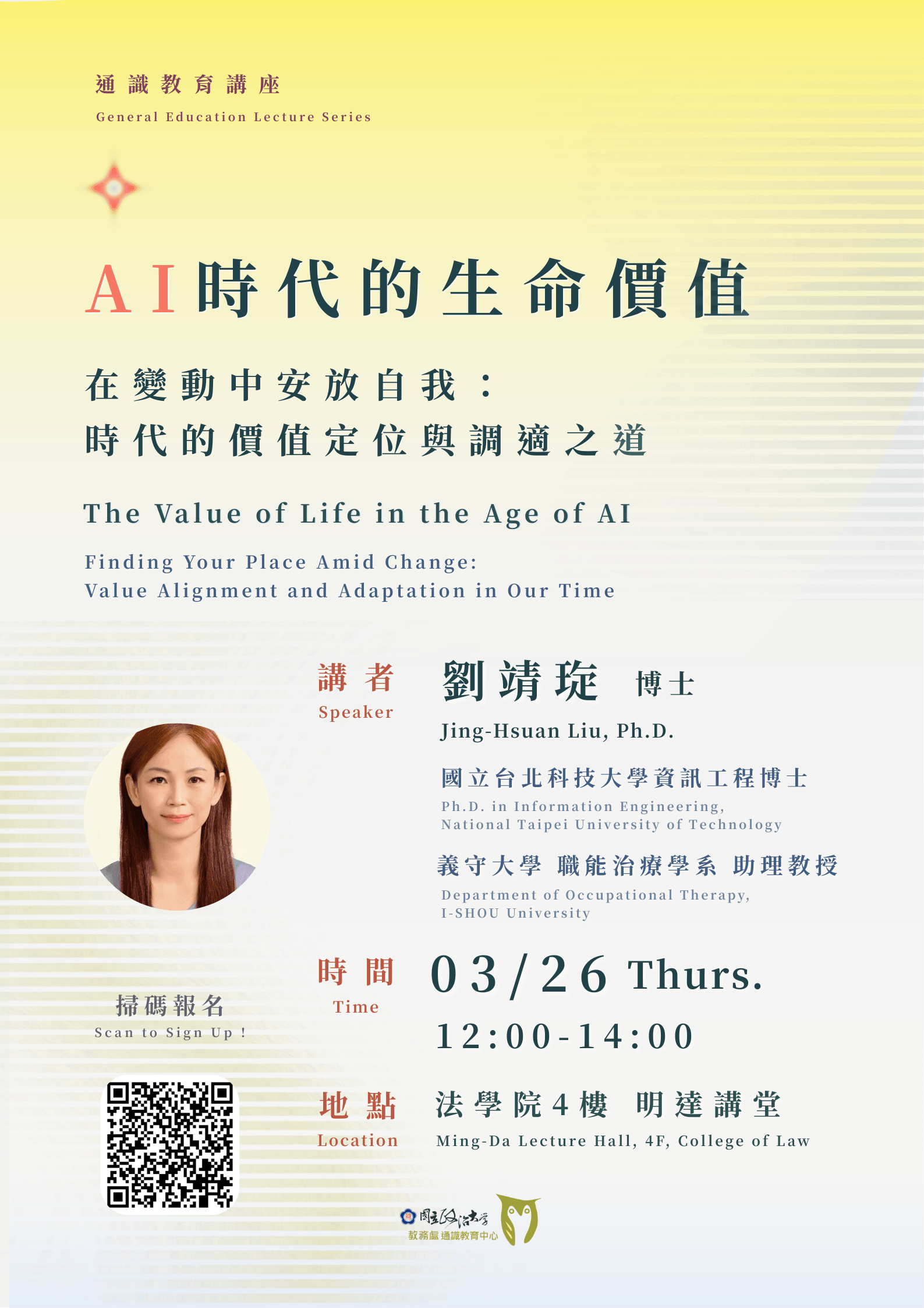 當 AI 能寫作、作曲、繪圖,甚至模擬同理心時, 我們是否也開始懷疑:自己的努力與專業還有價值嗎? 在 AI 快速改變世界的時代,許多人面臨對未來的不確定與焦慮。 本講座將帶領同學重新思考:當效率與知識不再稀缺, 「人為何而學、為何而活」,人類真正不可取代的是什麼? 講者將結合 AI 發展趨勢、心理學觀點與實務經驗, 分享如何在快速變動的世界中找到自我定位,培養心理韌性, 並透過「價值羅盤」思考內在價值、關係連結與生命貢獻。 這不只是一場談 AI 的講座,更是一場關於「我想成為怎樣的人」的思考旅程。