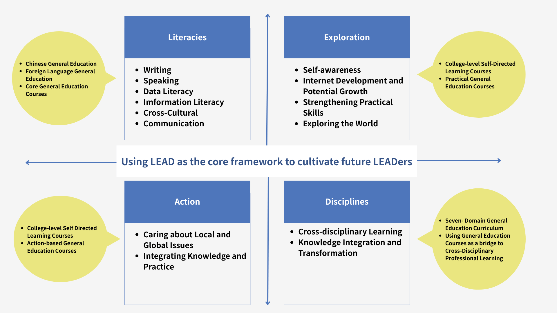 Students build a foundation of liberal arts core knowledge through core general education courses. With the support of institutional frameworks, general education serves as a stepping stone for interdisciplinary exploration and learning, integrating general and professional education while facilitating the transformation and synthesis of knowledge during the learning process. Guided by the curriculum framework across seven major domains and a self-directed learning system, students will develop strong civic literacy and cultivate lifelong essential skills such as broad perspective, self-exploration, critical thinking, and practical action. Aligned with NCCU’s future talent development goals under the “LEAD” framework, general education will continue to be refined and play a pivotal role in this developmental blueprint.