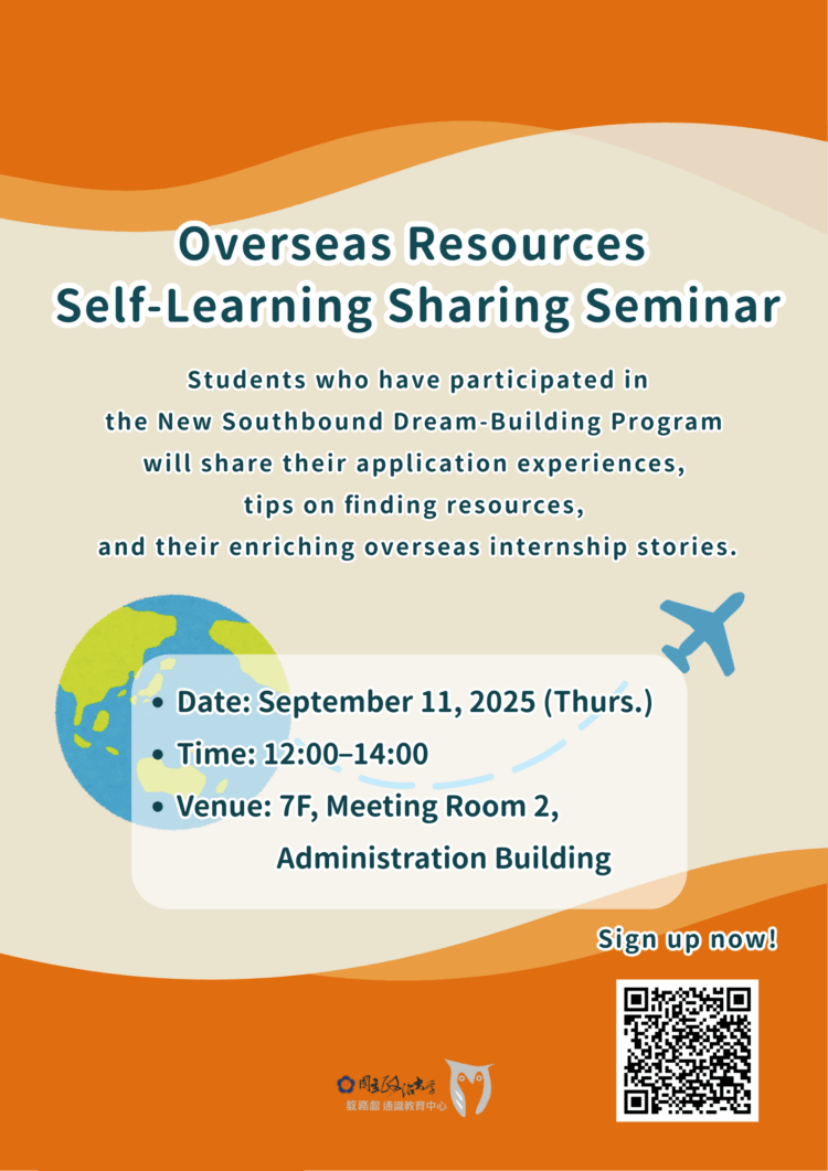In this seminar, students who have participated in the Ministry of Education’s New Southbound Dream-Building Program will share their application experiences, tips on finding resources, and their enriching overseas internship stories.